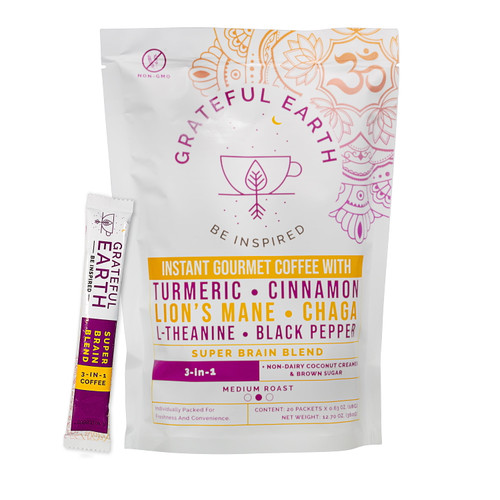 Grateful Earth Medium Roast 3-in-1 Instant Coffee Packets, 12.7 Oz, Super Brain Blend, 20 Packets